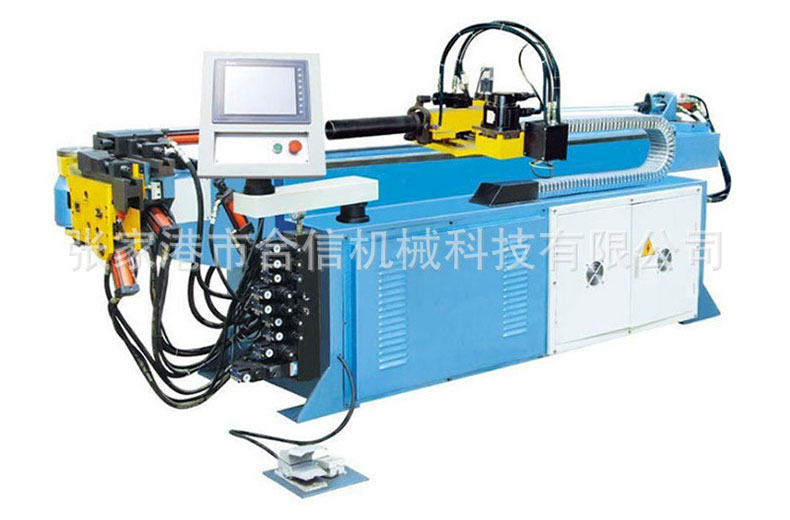 全自动数控弯管机性能特点: 1、本机采用PLC控制,加数控模块,人机界面触摸屏操作,程式设定简便容易。 2、送料为伺服控制,转角为伺服控制,弯管可选伺服驱动或液压驱动 3、本...